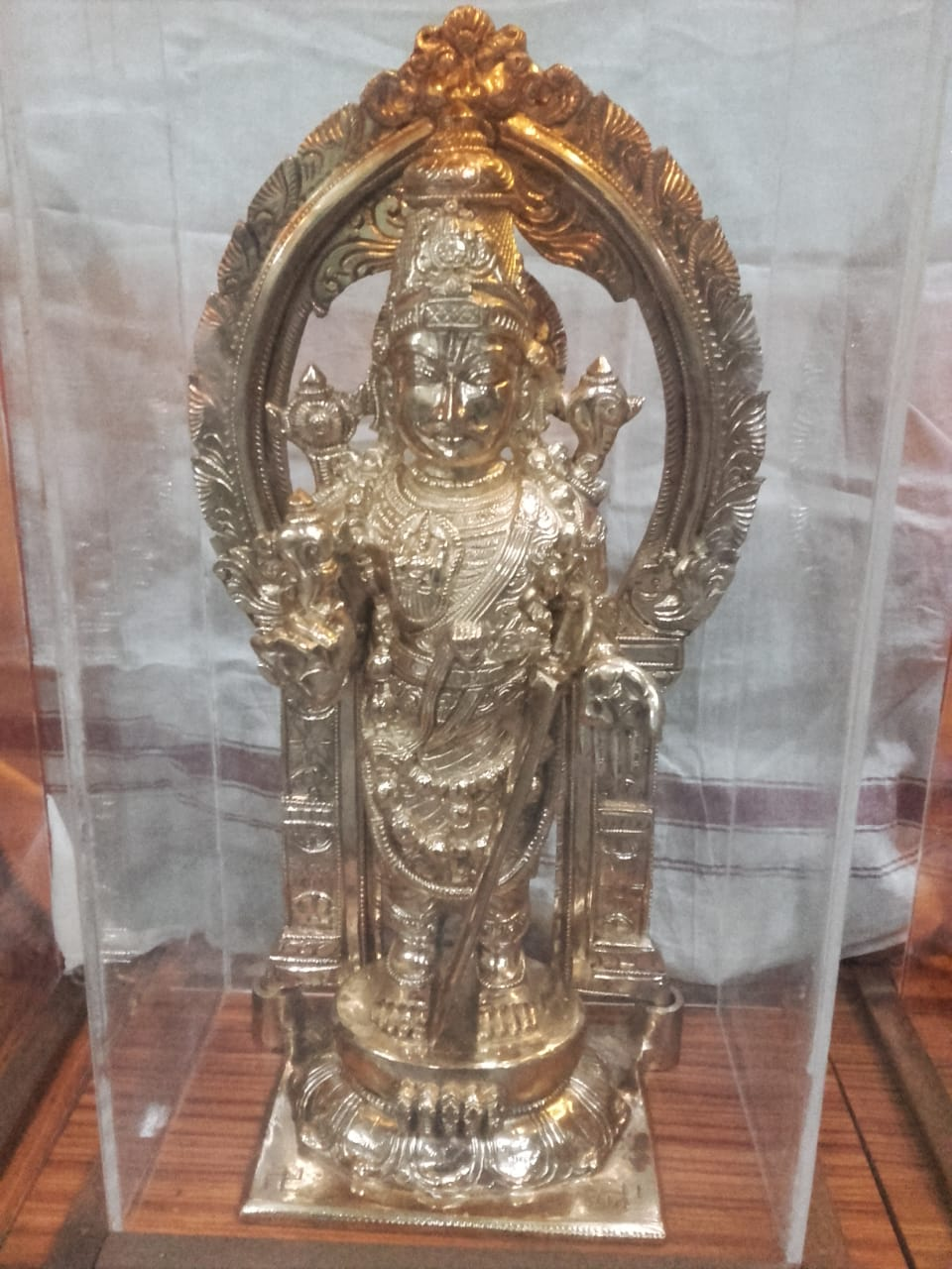 This is fully handmade process with superior quality of metals as this God diety is designed from head to foot with fully ornamental design works who has kept moustache standing on lotus base with Mahalakshmi on his heart blessing his devotees with flourishing wealth.